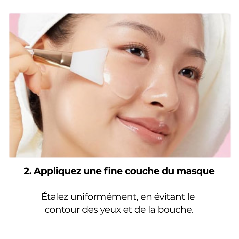 Appliquez le masque sur une peau propre, laissez agir le temps indiqué, puis massez les résidus pour booster la pénétration.